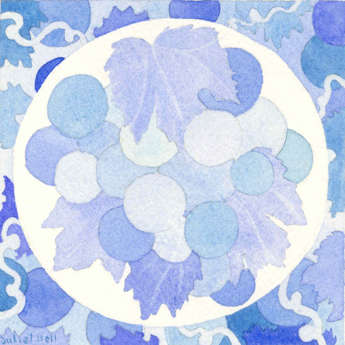 From Juliet Bell: “I had several ideas for the ‘Circles’ competition but none came to the fore until I fell asleep and dreamed I was having tea with a friend in her shop. On the wall behind my friend was a beautiful china platter, round, with a soft pattern of mixed blue circles and leaves suggesting grapes. The platter hung on a wall papered with a complimentary blue grape design. My dog barked, awaking me with this image sharp in my mind’s eye. This watercolor design (4” x 4”) is based on my dream. I love it when my dreams send me ideas.” (Juliet’s Etsy shop here.)