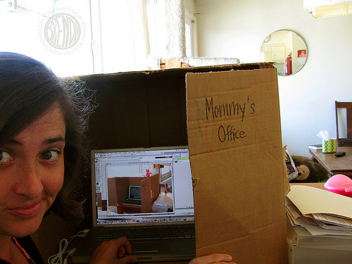 BP: Ha! I work in a box. Seriously. I have issues because I do not have my own space in my house. My husband promises me that I will have a studio someday when we buy a house…where I can paint and make big messes but right now I do not have that. I had to put my laptop (where I do most of my work) in a box in order to keep out the glare from the bright windows in our living room. What happened was really strange. I found that having my own space, no matter how small it was, gave me tremendous creative freedom. I feel more motivated to work when I am in my box. I love my box. As Virginia Wolfe says, “a woman must have money and a room of her own…” Mine just happens to be really really small.