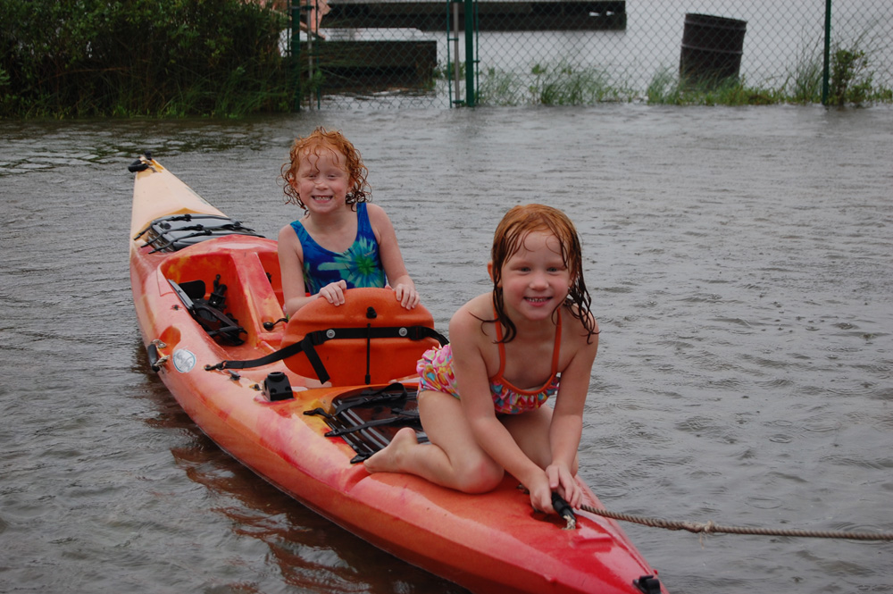 As Tropical Storm Fay took up residence over North Florida for three days last week, we lost all electronic means of entertaining the girls. Now, don’t get me wrong; I’m not a big proponent of TV. I don’t really watch much myself at all (except for Antiques Roadshow and TLC’s What Not to Wear, but that’s another story), but when your children are up by 6am, your DH leaves for work at 6:15am, and you are responsible for getting yourself ready for work, your kids fed and ready for school, lunches packed, taking the kids to school and getting yourself to work on time (which remarkably rarely happens), a little Between the Lions and Max and Maya on PBS can be your best friends. But last week, for FIVE DAYS, we had no Between the Lions or Max and Maya. Now grant you, we did get power back after a day but did not get cable or internet back for five days, and there’s just so much Barbie Mariposa on DVD you can take. “Take them outside!” you say. (Did you miss the part about the tropical storm hanging over us for three days?) Oh sure, we’ll take them outside and let them play in the river, which was literally in the backyard.