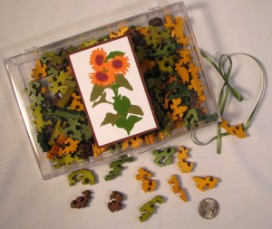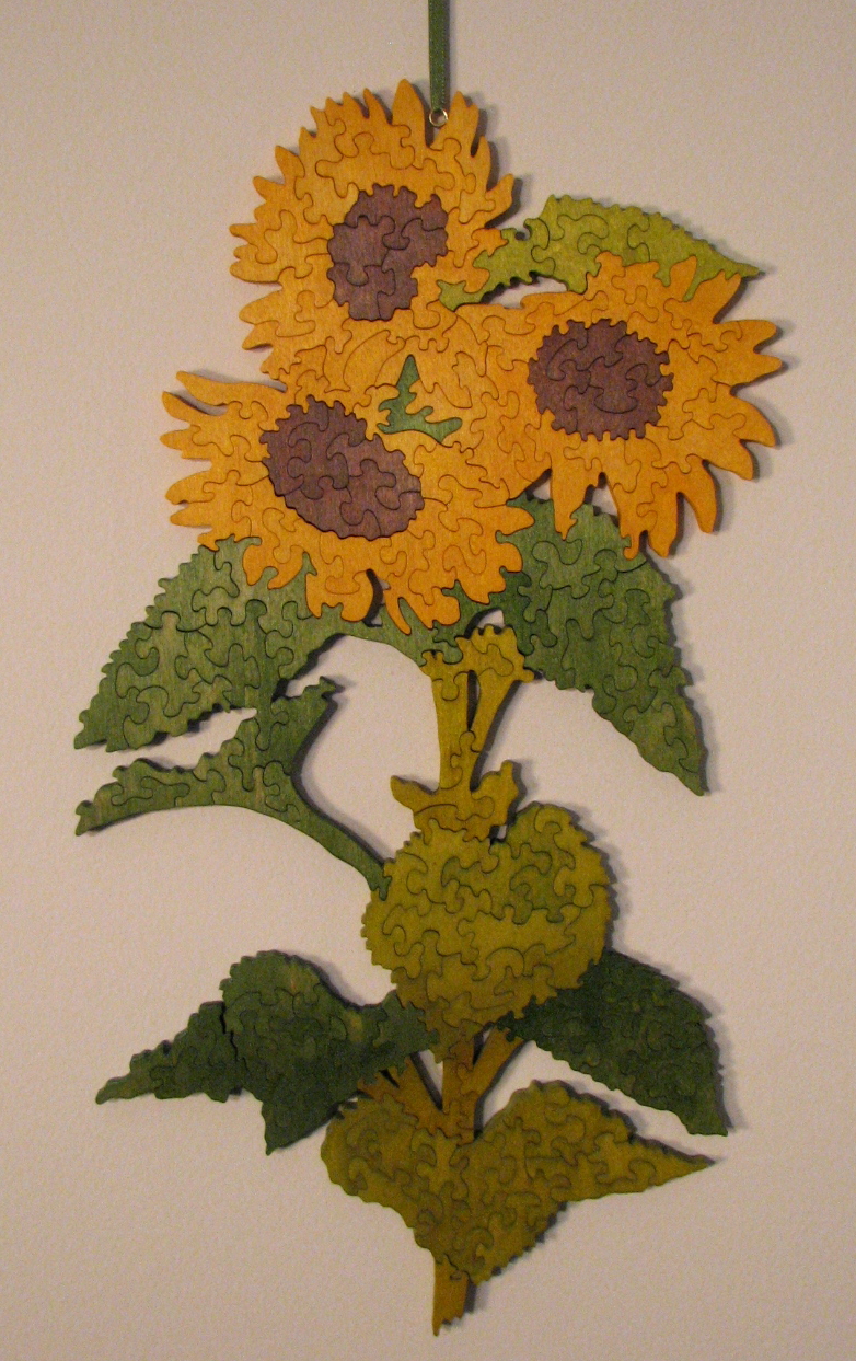 From Juliet Bell, an original piece of wood art: “I happened to be in the midst of making this sunflower puzzle to auction on eBay, so I was delighted to see sunflowers as the new prompt! This is a double-sided, stained, wooden, hanging, jigsaw puzzle with 131 pieces, measuring 10″ by 6’5″.”