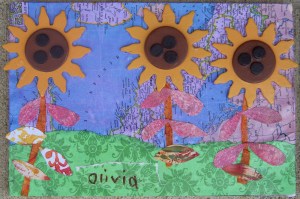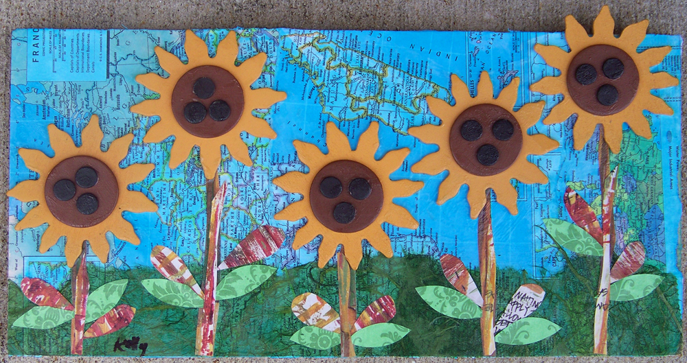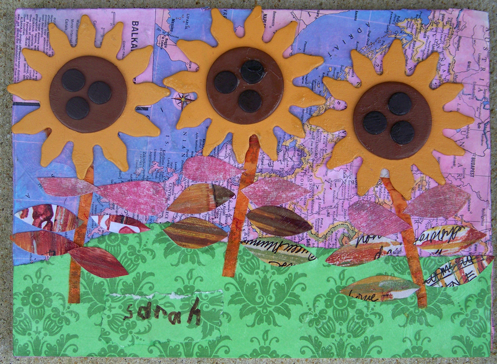 Sunflowers are blooming everywhere — and there’s quite a harvest right here at Creative Construction. Our winner for this week’s creativity contest is Kelly Warren, who had a sunflower art session with her daughters. Love the initiative, Kelly! She writes: “My girls and I had an art afternoon yesterday around the sunflowers prompt, and we had so much fun! We found the little wooden sunflowers on the clearance aisle at Michael’s, and then just pulled everything together with supplies I had at home. I created mine and taught the girls each step, step by step, as I was creating. We started with some old discarded wood and covered our wood with maps (as inspired by Elizabeth Beck!). Then we painted water colors over our maps: I chose blue, Sarah chose pink, and Livvie chose purple. Then we selected the papers we wanted to use for the grass, stems, and leaves and started cutting and gluing layer upon layer. The toughest part for them was giving the piece time to dry between layers. I’m not sure who’s prouder of their finished products, me or them!”