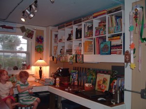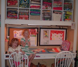 I am blessed! When we built our house, we initially did not close in the ground floor (we live in a stilt house). After a few years, we closed in one side of it for a real garage, and after another couple years, we closed in and air-conditioned the other side for a workshop and playroom. That’s really where we spend most of our time now. My workshop is about 8′ x 12′ with shelves and bench space all around. It’s wonderful! Now I just have too many supplies! We also created an art bench adjacent to my workshop for the girls since they were starting to take over my space. The rest of the space includes a flat-screen TV and comfy couch for DH to hang out and do guy stuff. As far as the blogging aspect, I have my laptop in my workshop for quick stuff (and entirely too much distraction at times), and a larger desktop upstairs in my office, which is conveniently located just outside the girls’ room.