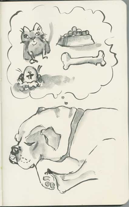 So, my entry this week is a page from my Moleskine sketchbook, entitled “Dog Dreams” — which features an imaginary interpretation of what my American bulldog (girl), “Ripley” sees when she slumbers.