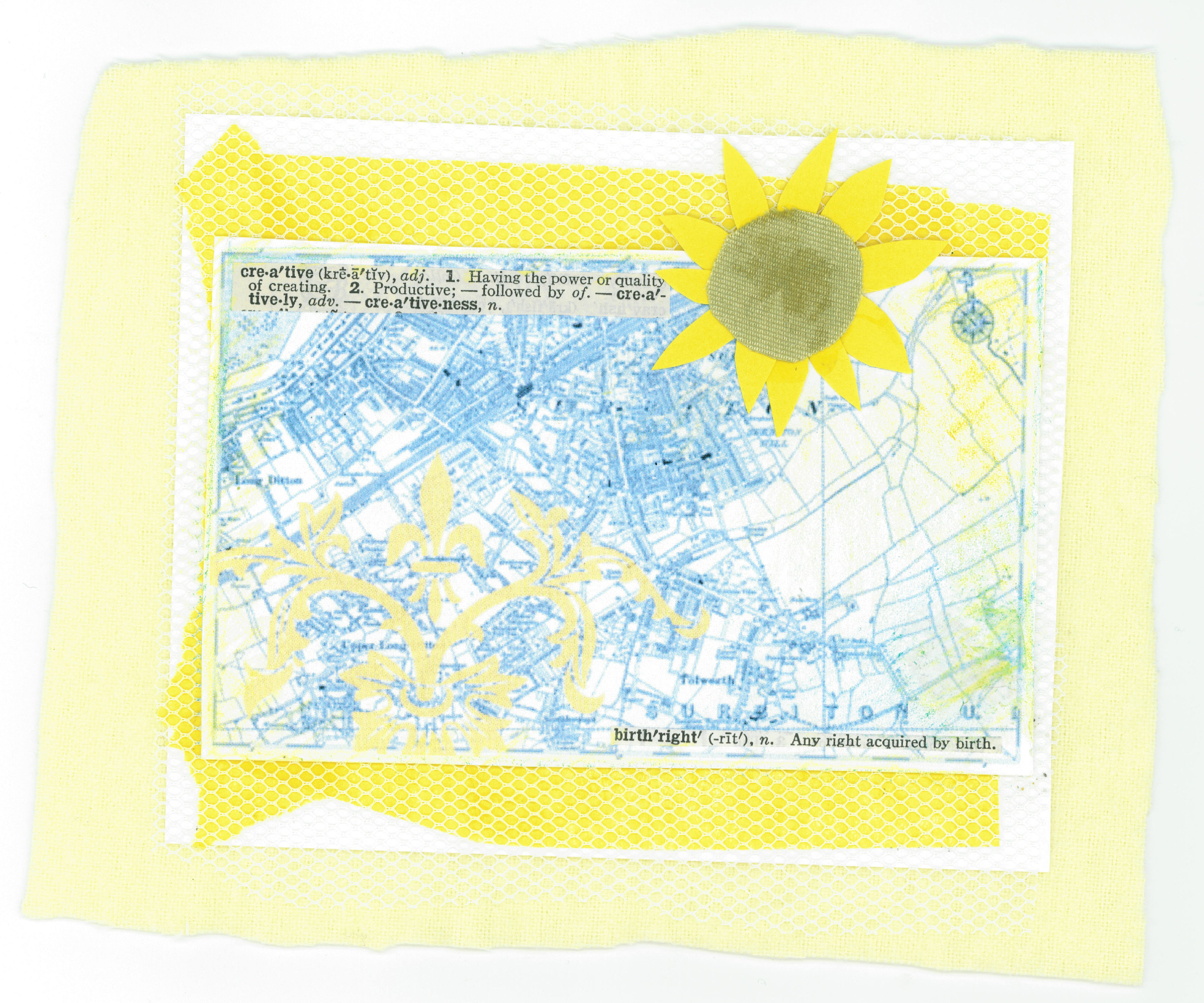 From me (Miranda): I recently listened to this old podcast interview with Keri Smith, which got me thinking about the creative inheritance of childhood. Lately I’ve been thinking about work that links to my past. The piece I created for the map prompt is about documenting my creative birthright; my origins (the map is of a town in England that was one of my early homes) and what I was given by my mother, who is what I could call reflexively creative. The past can been seen as a map from which we navigate the future. The sunflower is a personal icon of sorts, and in this instance echoes the compass icon used on many maps. This piece isn’t quite what I set out to do, but it is what it is. (Kind of like me.)