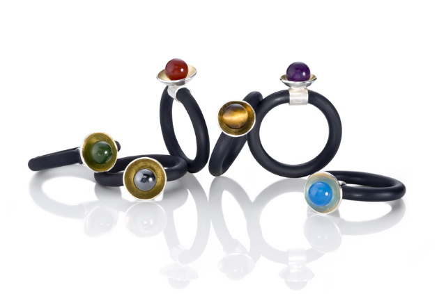 TI: It’s always difficult to answer this question because I feel so often that my work and ideas come out of nowhere. My inspiration comes from basic geometric shapes in nature and architecture and repeated patterns. It’s what feels good to me. My process is about playing and discovering new ways of engineering or putting together interesting parts in a simple yet aesthetically pleasing way. What is produced tends to mirror a much deeper connection to rhythm, balance, and feminine energy. Usually it is someone else who is drawn to the force of energy around a certain design and points it out before I notice it as more than just a really nice thing to wear. Even though I would like to explore making work that is deliberate in expressing my deeper connection to and interest in what I would describe as the divine feminine archetype, my work of late has been jewelry that’s purely for fun and fashion and affordability. That has been both from necessity and desire to work with new materials (rubber). The outcome is a body of work that could be described as “urban tribal,” which I guess, does, in its own way reflect a modern feminine (and masculine) archetype idea.
