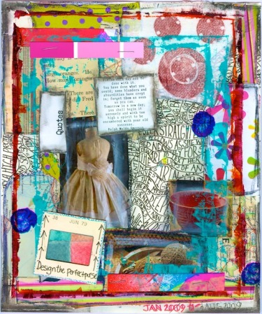 Later (as in months), I added bits from an old children’s math text (discovered in my dad’s attic), quotes, paint chips, maps, psychedelic batik cardstock, cotton fabric stamped with a handmade FIMO stamp, fluid acrylic paint, even a 35mm slide case.