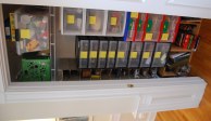 At the same time, my art closet was no longer the tidy, organized collection of art supplies that it was a year ago. I often found it too difficult to put things where they belonged and ultimately resorted to opening the door, tossing in whatever belonged in the closet, and quickly closing the door again before the object could fall out. Many of my key supplies were too difficult to get out (note the large plastic bin on the top shelf). In all, the closet turned out to be less than ideal for art supplies. Good for storing, perhaps, but not so good for using.