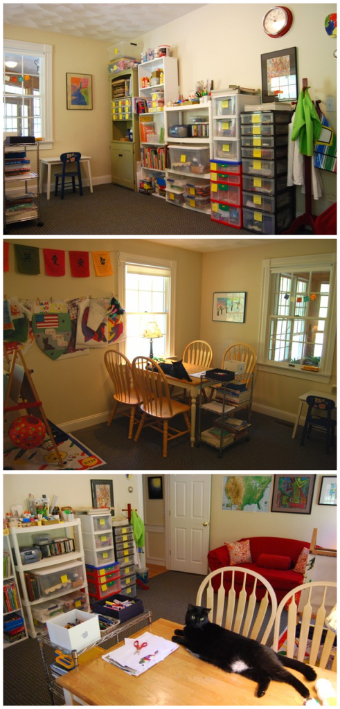 So, all of the toys came out of the playroom. Many of them went up into the attic for donation/yard sale; some of them went into the boys’ bedrooms. Then all of the art supplies in my art closet went into the playroom, now dubbed the art room. Board games went into the old art closet. I positioned an old table in front of a window in order to make use of natural light, as this room tends to be a little dark.