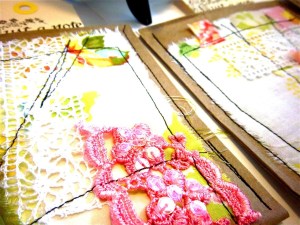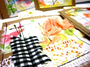 I’ve been having fun in my studio these days, and am playing with all kinds of new things like fabrics, buttons, fancy trims, fabric paint and more!