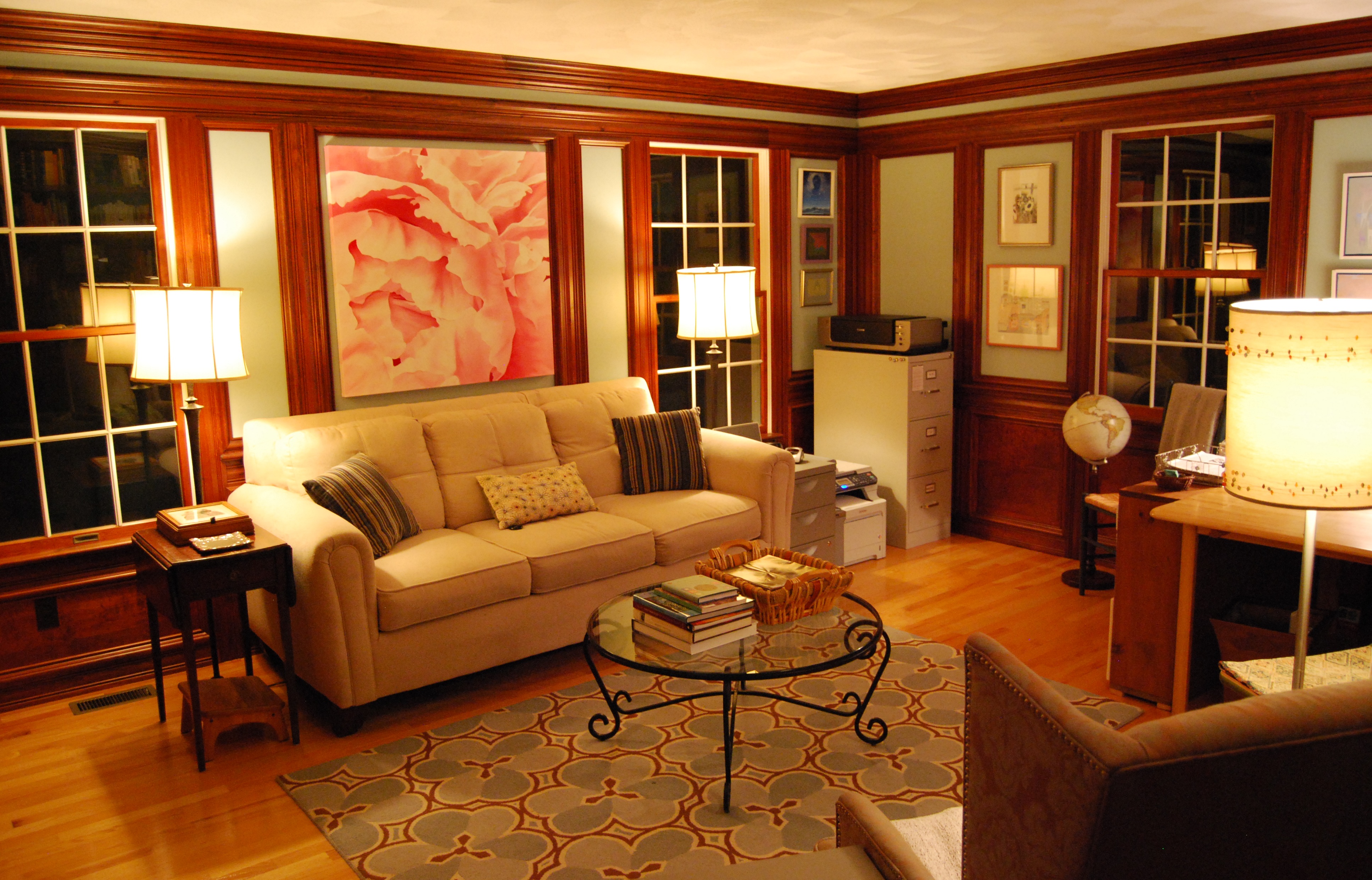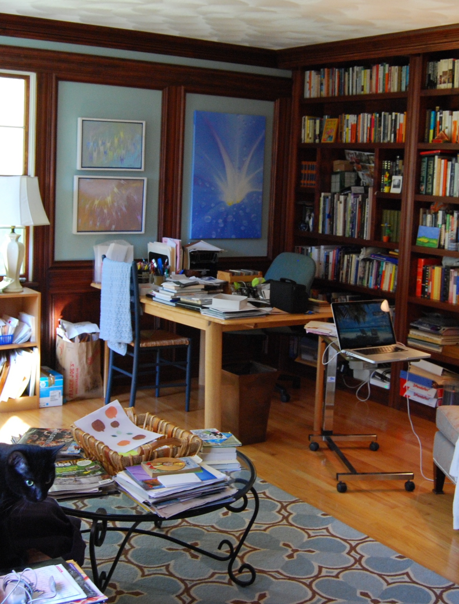 The basic footprint of the room hasn’t changed (months ago, we tried many different arrangements of the furniture, but nothing else worked). I did change out a yucky fiberboard bookshelf for a marginally better, longer bookshelf made by my ex-husband. (No, you can’t have it back!) Please ignore the hospital-style table on wheels (it’s one of the most practical things I own, and I use it all the time).