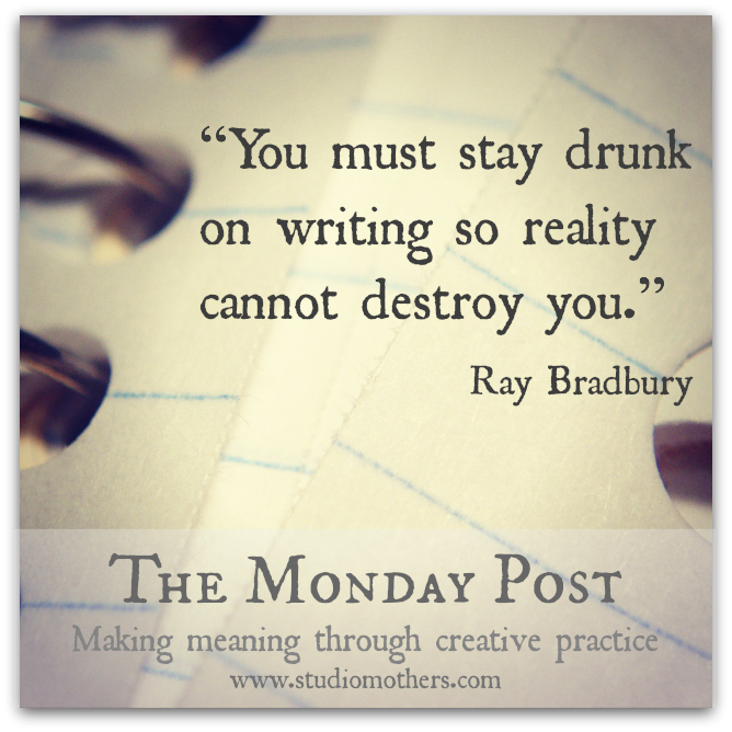 Today I popped over here because I was sure there was something I missed. I see my Writing Drunk blog post fits perfectly with the Ray Bradbury quote – SYNCHRONICITY! My Creative Intentions for this week are to continue to move forward with my two mixed media works (and enjoy the heck out of the creative process), to play with the new art I am trying. (I seem to be at an impasse, I think due to fear…) and then to write write write. I seem to be coming back into myself. Must be Spring and rebirth and all that… I just feel so alive! And the final Creative Intention is to stay awake enough to hear what my muses are calling me to birth. Last night’s trip -totally spontaneous – to the almond orchard – was spectacular. I am intending for MORE of that!!