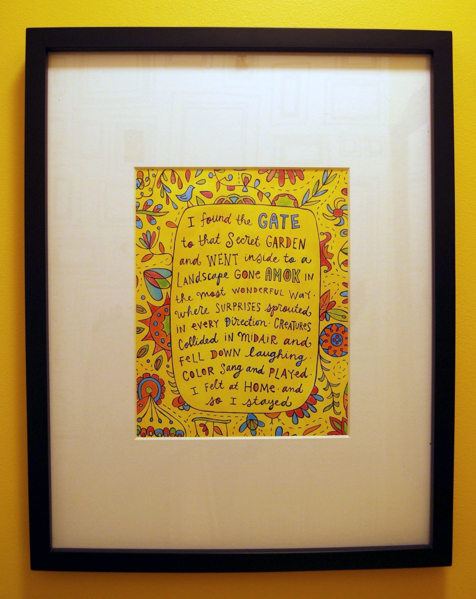 You’ll see that this little room features two of my recent acquisitions from Aimee Myers Dolich of Artsyville. I love her work — and I especially love how the “doodles” and black frames (inexpensive frames from Target) echo the intention and inspiration of our create-it-yourself wallpaper, as well as the color of the painted walls. (And per the doodle, there ARE stacks of books in this room too — well, a shelf full, anyway!) A beautiful fit.