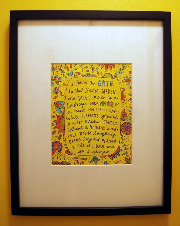 When I stumbled across this wallpaper last year, I had to have it. And I don’t even like wallpaper. But the idea of being able to write on the walls — permanently — filled me with excitement. One wall of paper would do it. (I trash-picked the mirror hanging above the sink, so that added a few dollars to the budget.) Bright paint would go on the other walls. The only “rule” for writing on this wall is not to create anything obscene. (I have teenagers, so a rule like this is actually necessary.) Other than that, anything goes. I’ve added a few collage pieces, and I look forward to creating a few mini paintings. The wall has become something of a guest book, too. We encourage guests to add something to the wall as a remembrance of their visit. And of course, all ages are welcome to contribute. (Yesterday I overhead one of my 14-year-old daughter’s friends exclaim: “You mean you can just come in here and write on the walls any old time you feel like it??” And my daughter’s response — slightly smug — “Yup!”)