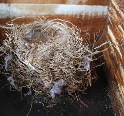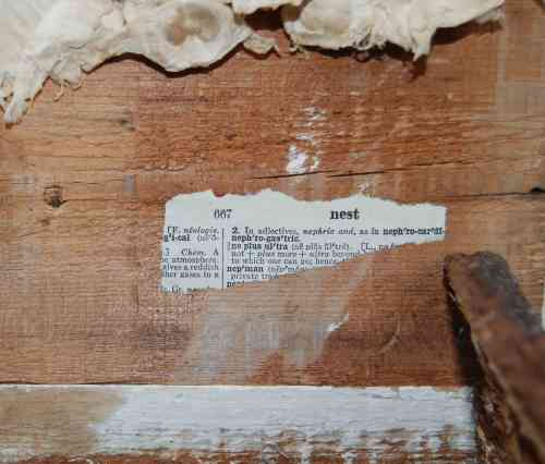 I extrapolated “nest” into birdhouse, seeing as a nest is, in most literal terms, a bird’s house. Like any nest you would find in nature, my birdhouse was constructed with things that I found around me. The nest itself is real, salvaged from a bush outside my office window after it was no longer needed. The base of the piece was cut from a section of the wood that used to belong to my childhood piano — a behemoth old painted upright that I had to ditch when the soundboard cracked. (Before it was hauled away, I removed a piece of the case and popped off all of the beleaguered ivory veneers.) So for me, this birdhouse, and the timing of its reconstruction, has many layers of meaning.